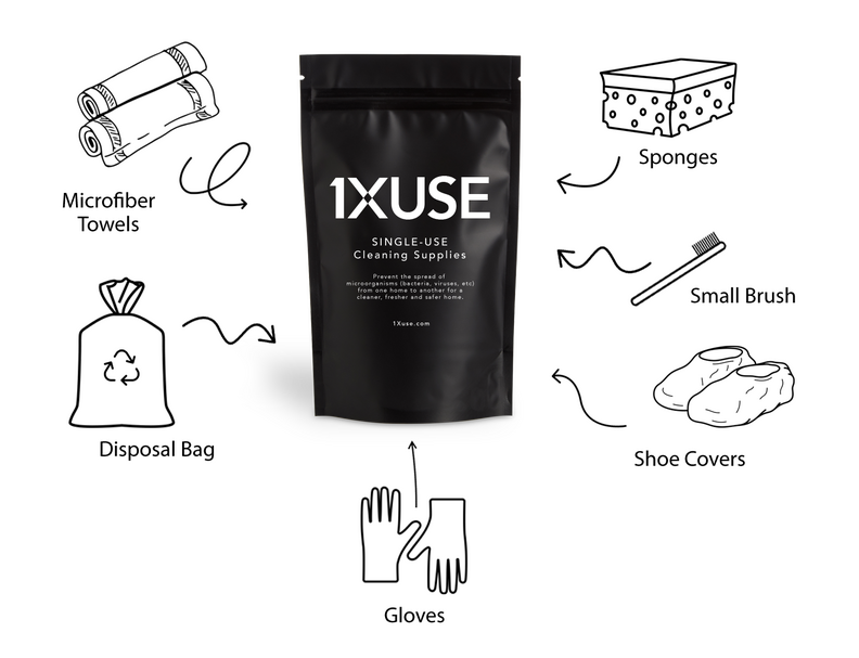Cleaning with 1XUSE helps reduce germs and lower the risk of infection within your home. Traditional cleaning tools like brushes, towels, and sponges can harbor a wide range of microorganisms—especially when reused between homes. When these items are used in kitchens and bathrooms, they can become contaminated and act as carriers for potentially harmful pathogens. Each time they’re reused, these microorganisms can be spread through direct contact, transferring bacteria and other germs onto surfaces throughout your home. 1XUSE eliminates this risk by ensuring all cleaning supplies are single-use and disposed of responsibly after each visit.
